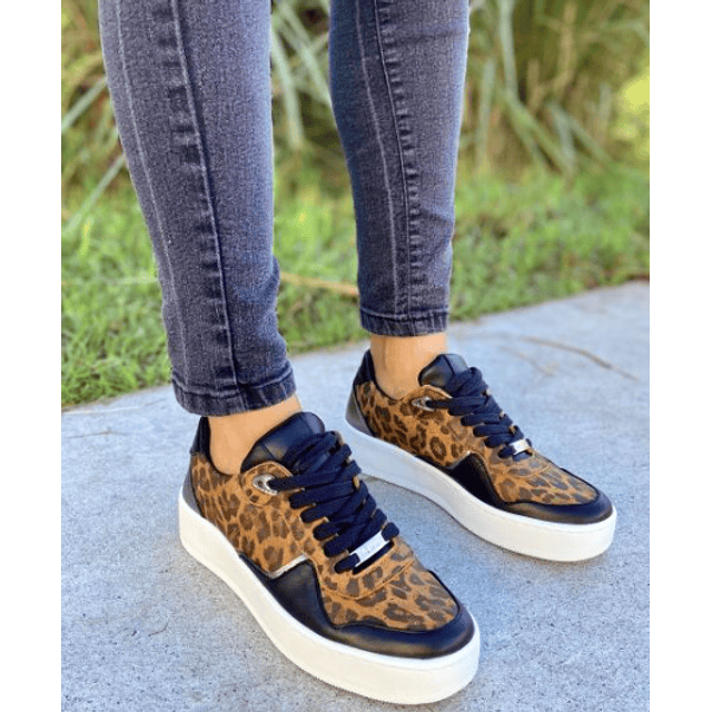 Zapatilla de cuero vacuno print con detalles en cuero negro y peltre con suela de goma de 4 cm